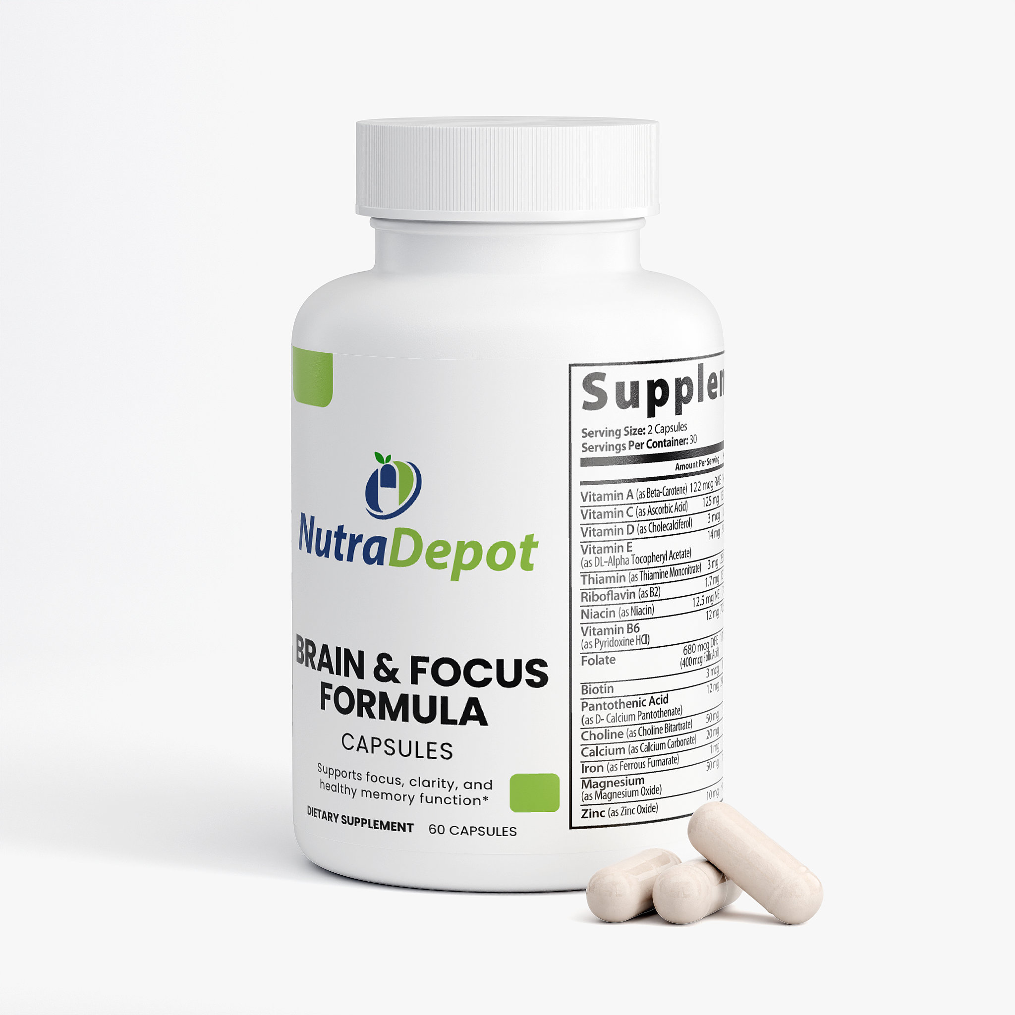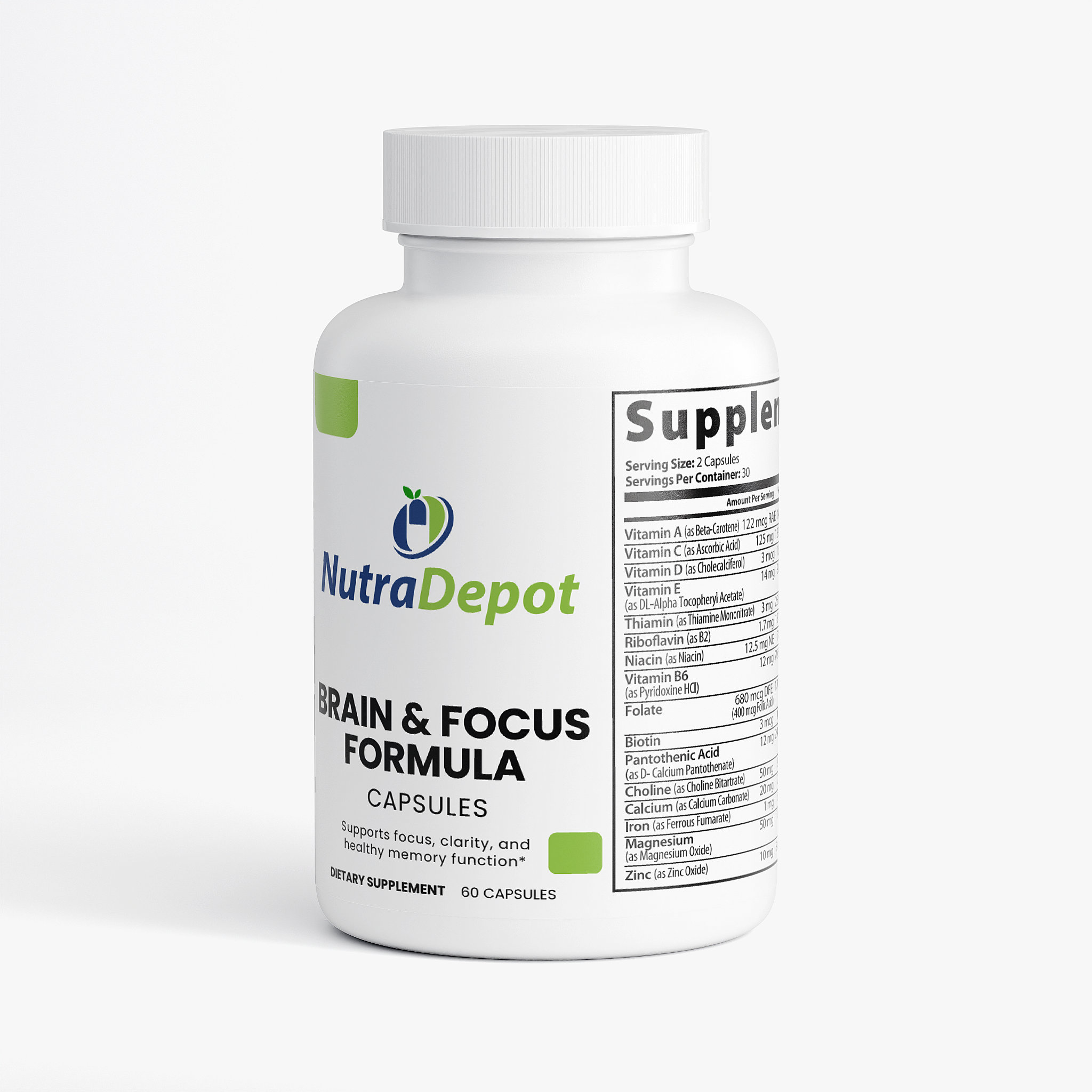 Ingredients: Vitamin A (as Beta-Carotene), Vitamin C (as Ascorbic Acid), Calcium (as Calcium Carbonate), Iron (as Ferrous Fumarate), Vitamin D (as Cholecalciferol), Vitamin E (as DL-Alpha-Tocopheryl-acetate), Vitamin B1 (as Thiamine Mononitrate), Vitamin B2 (as Riboflavin), Vitamin B3 (as Niacin), Vitamin B6 (as Pyridoxine HCL), Folate, Biotin, Vitamin B5 (as D-Calcium Pantothenate), Magnesium (as Magnesium Oxide), Zinc (as Zinc Oxide), Selenium (Selenium Amino Acid Chelate), Copper (as Copper Gluconate), Manganese (as Manganese Amino Acid Chelate), Chromium (as Chromium Picolinate), Molybdenum, Potassium (as Potassium Citrate), Choline (as Choline Bitartrate), Proprietary Blend (DMAE Bitartrate, L-Glutamine HCL, Glutamic Acid, Green Tea Extract, Bacopa Extract, Inositol, Bilberry Fruit Extract, GABA, Grape Seed Extract, Grapefruit Seed Extract, Olive Leaf, Cinnamon Bark Extract, Licorice Root Extract, Boron, DHA 14%, Vanadyl, Phosphatidylserine, Huperzine A, Hypromellose (vegetable capsule), Rice Flour, Magnesium Stearate, Silicon Dioxide.