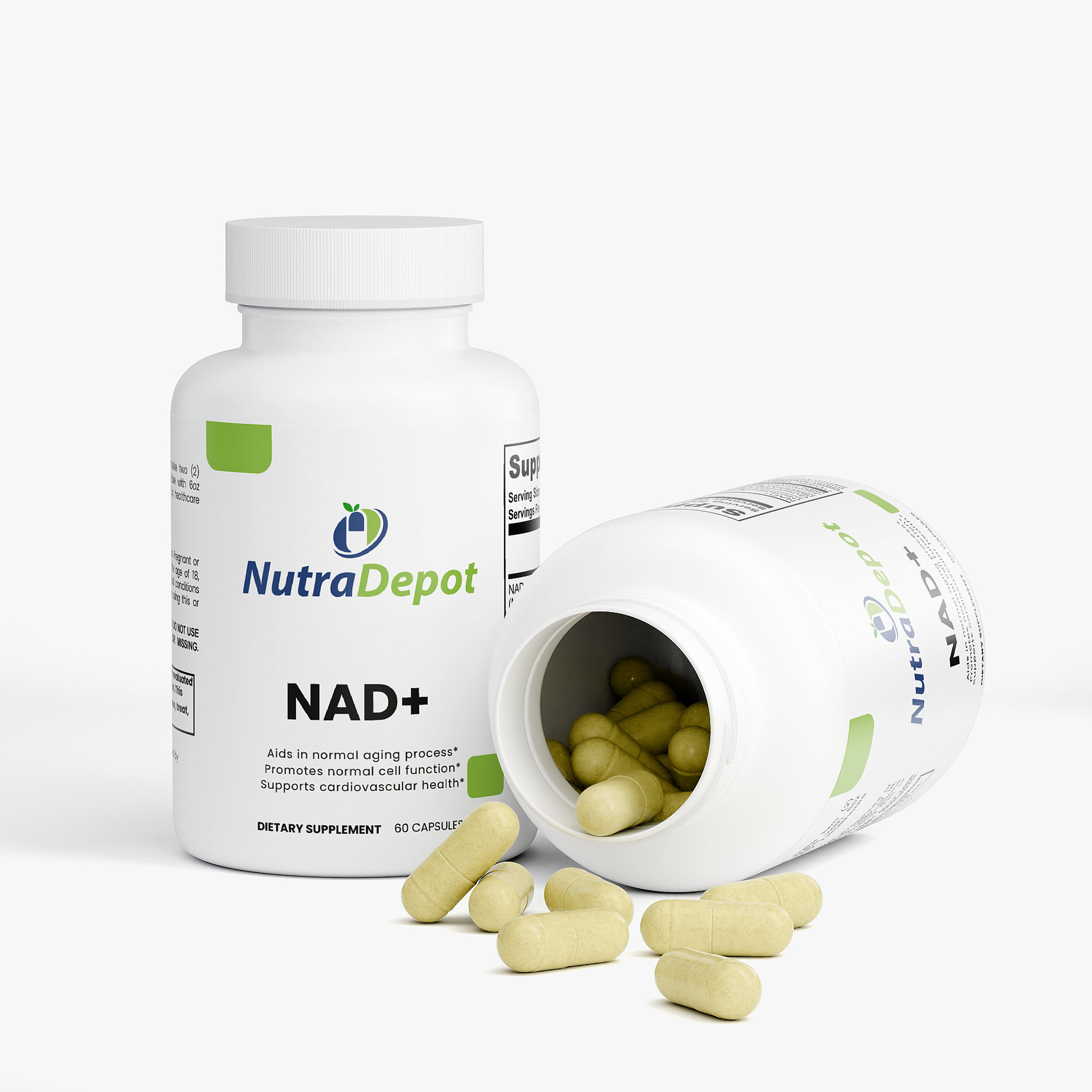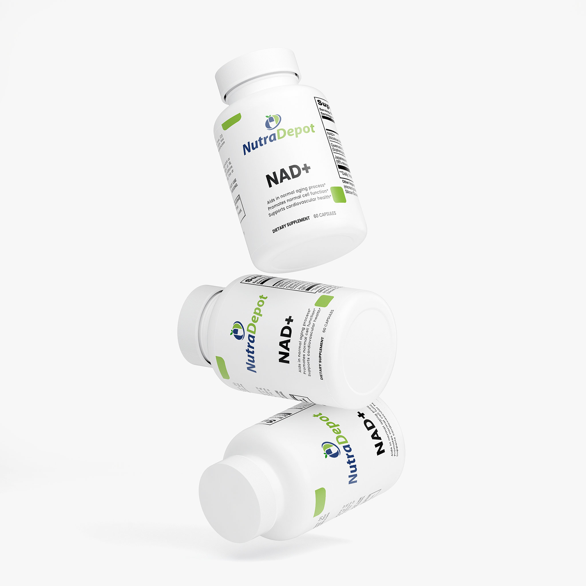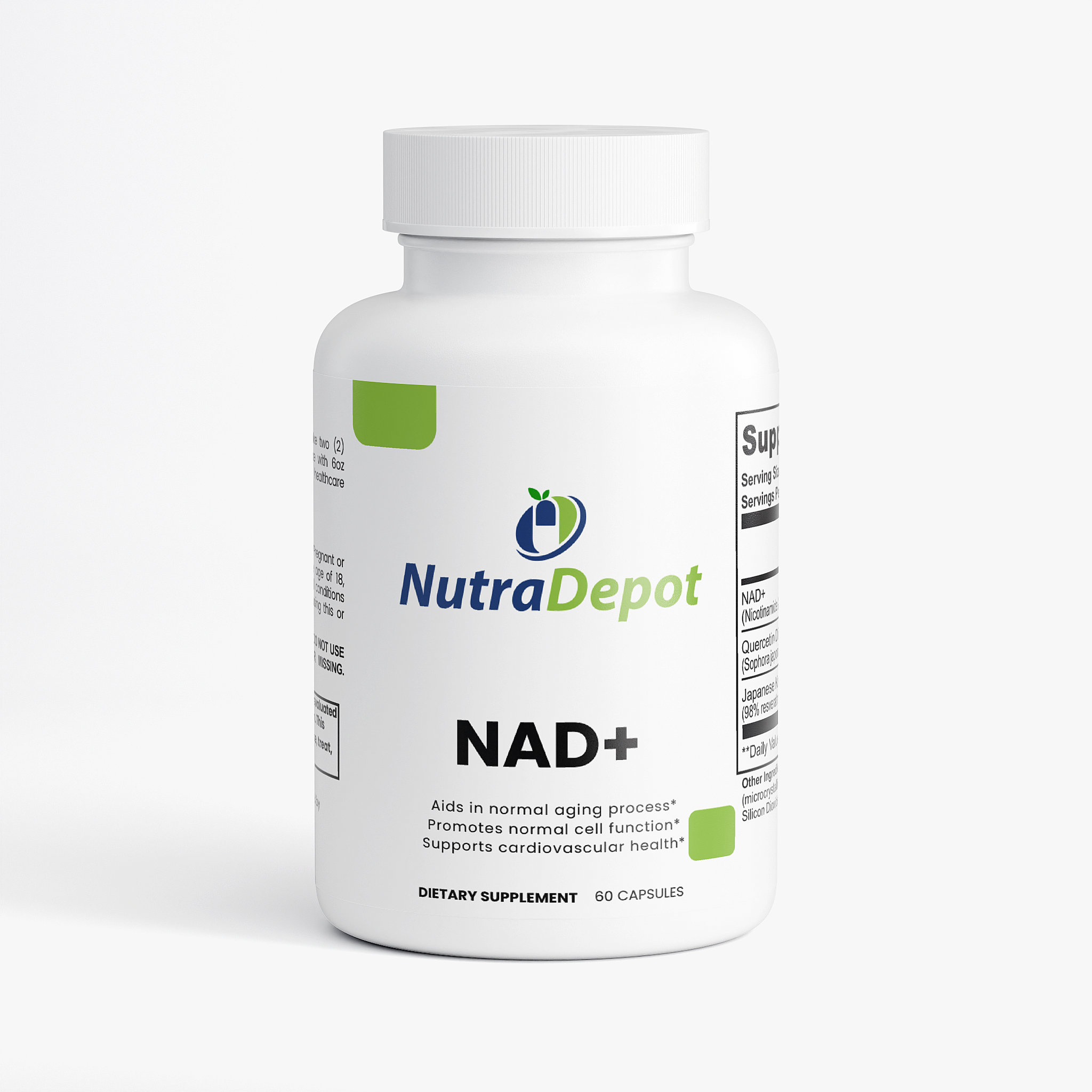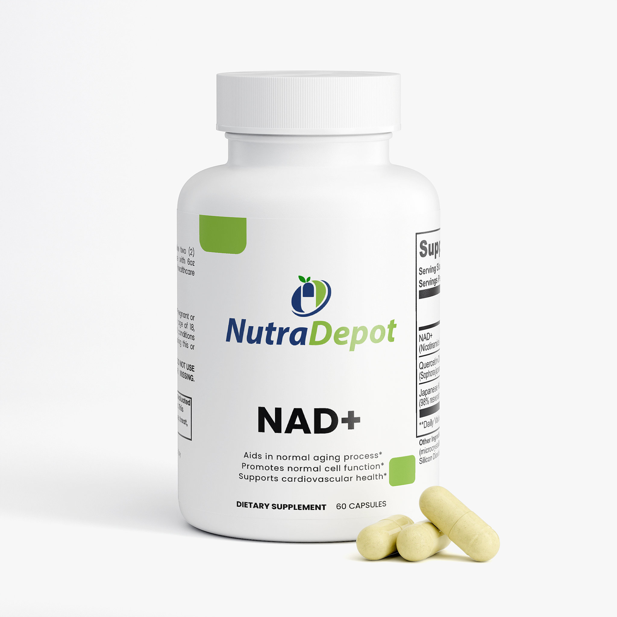 Ingredients: NAD+ (Nicotinamide Adenine Dinucleotide) (500 mg), Quercetin Dihydrate Extract (Sophora japonica) (whole flower bud) (250 mg), Japanese Knotweed Extract (98% Resveratrol) (Polygonum cuspidatum) (root) (150 mg), HPMC (vegetable capsule), Microcrystalline Cellulose (MCC), Brown Rice Flour, Olive Oil, Silicon Dioxide, Magnesium Stearate.
